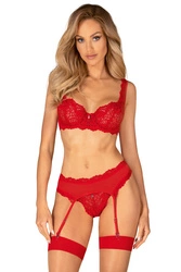 Obsessive Amor Cherris 3-pcs set Nocna komplet biustonosz + stringi + pas do pończoch, czerwony