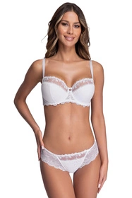 Między miseczkami Ava 1030 biustonosza znajduje się kokardka z ozdobą, która nadaje biustonoszowi dziewczęcego charakteru. Mostek koronkowy dodaje mu jeszcze więcej elegancji i subtelności. Boczki biustonosza wzmocnione są fiszbinami pionowymi, co zapewnia dodatkowe podparcie i utrzymuje biust w odpowiedniej pozycji.