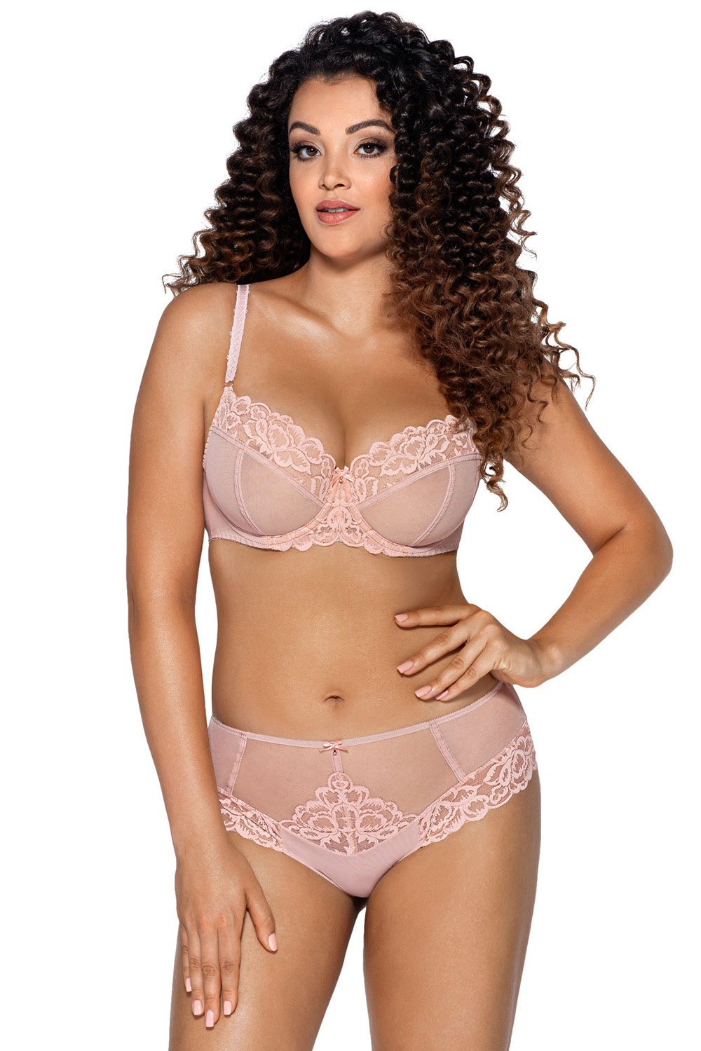 - górna część miseczki oraz mostek wykonane są z koronki przeplatanej złotą nicią