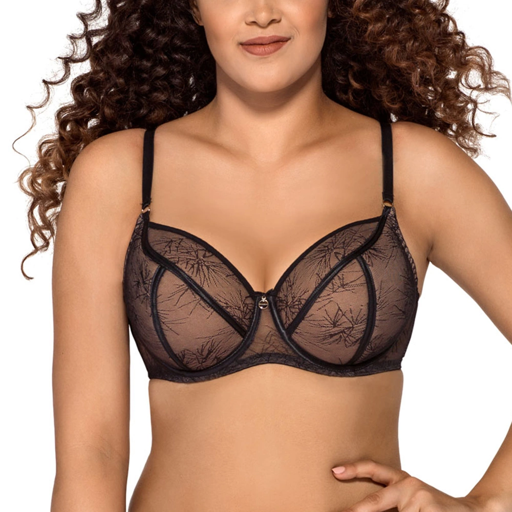 • usztywniane miseczki z wzorzystej siateczki podszytej beżową dzianiną