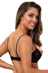 Skuś się na odważną stylizację w biustonoszu typu „peek-a-boo”, który idealnie podkreśli linię Twoich piersi a zarazem wyeksponuje ich krągłość i seksapil. Wygodny i delikatny model uszyty z czerwonego flizu oraz czarnej koronki bogato zdobionej elementami z miękkiego floku to absolutny hit sezonu. Dodatkowo znajdziesz w nich uroczą ozdobę w postaci kokardki pomiędzy miseczkami. Biustonosz posiada regulowane i nieodpinane ramiączka oraz trzystopniową regulowaną haftkę. Wszystkie metalowe elementy są w kolorze złotym, aby jak najbardziej rozświetlić tą wyjątkową stylizację.