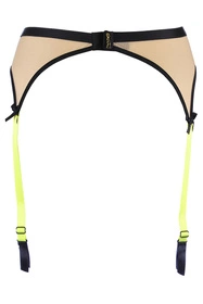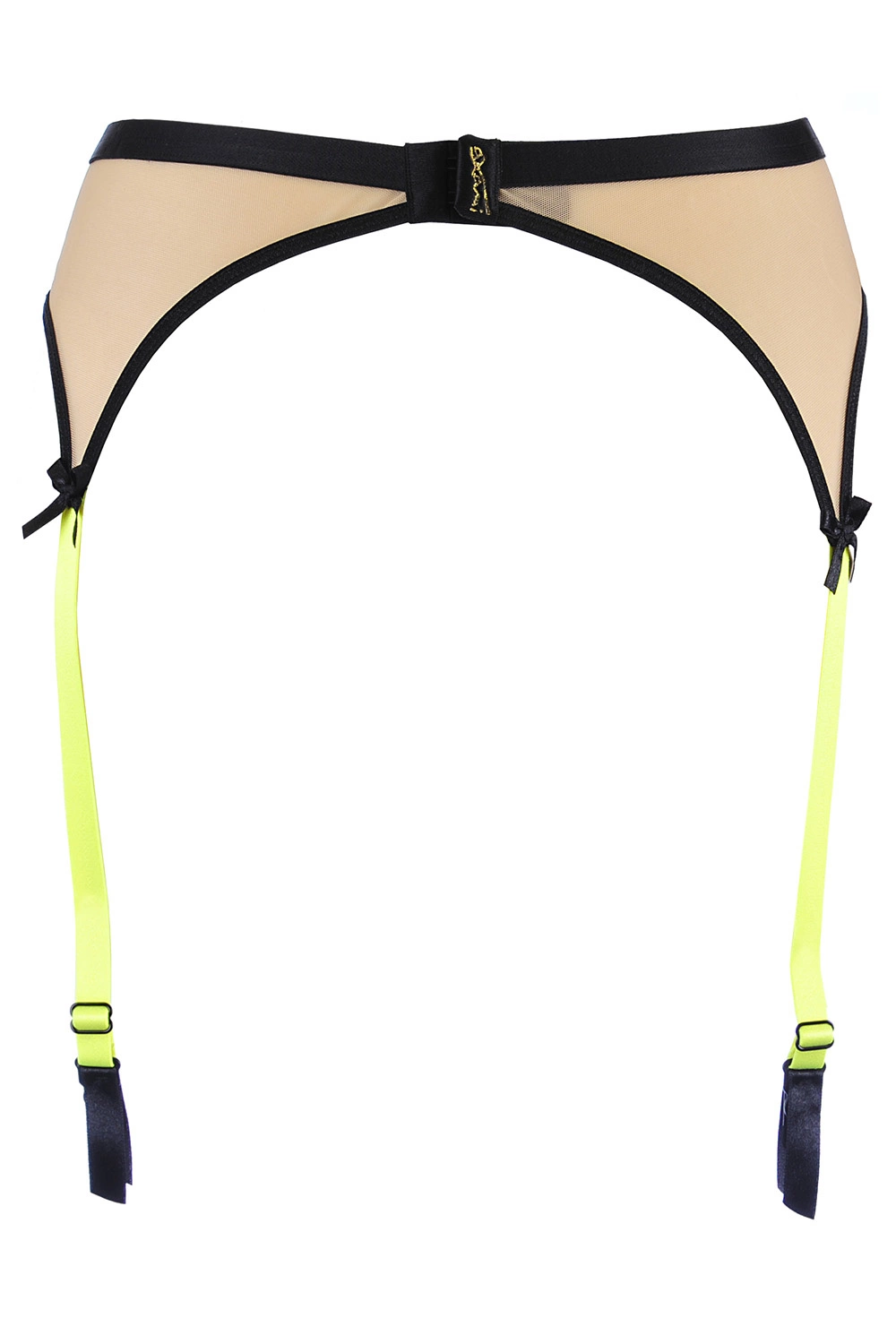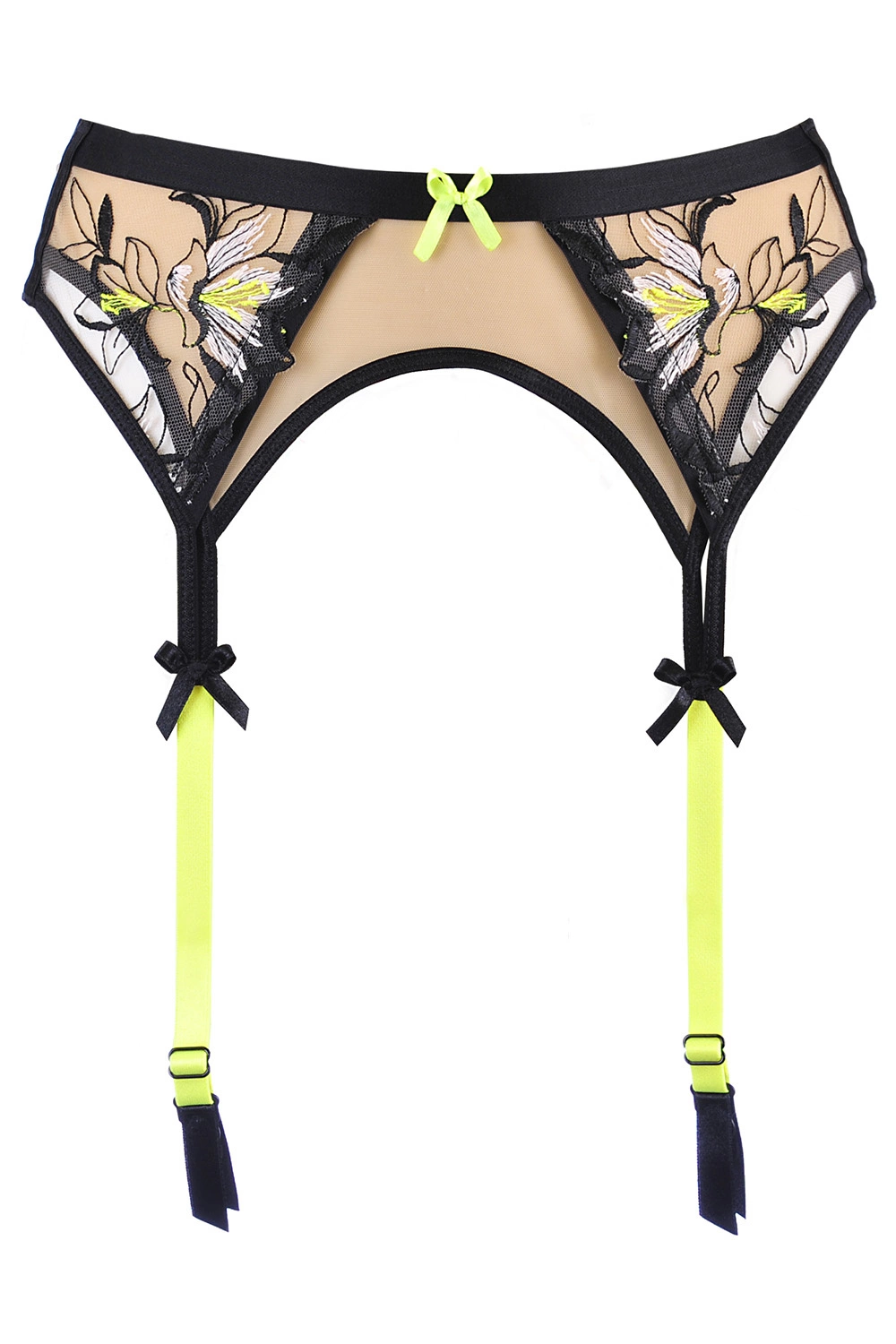 Ekskluzywny pas do pończoch z czarno-białym haftem i neonowo żółtymi dodatkami.
