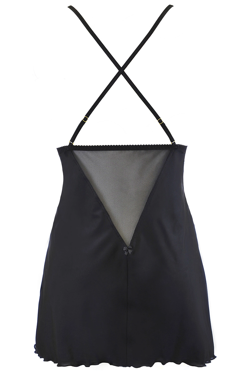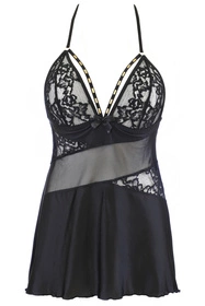 Odkryj w sobie drapieżność w efektownej, czarnej koszulce. Całość wykonana z bardzo miękkiej i elastycznej mikrofibry z koronkowymi wstawkami. Dekolt zdobią paseczki z dodatkami w kolorze złota. Regulowane, nieodpinane ramiączka krzyżują się na plecach.