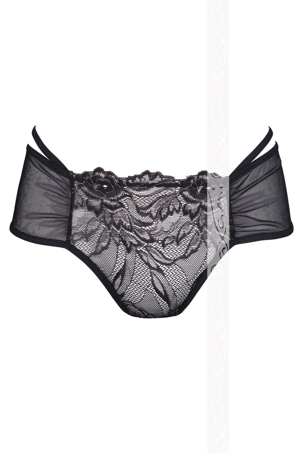Zwodniczo skromne figi Meteorite zaskakują niezwykle seksownym tyłem. Przejrzysty tiul, oraz zmysłowy, złocisty ażur koronki ujawnią jedynie skrawek tajemnicy – od Ciebie zależy, czy zechcesz ujawnić więcej. Awangardowy krój zapewni niepowtarzalne i namiętne odkrycia…
