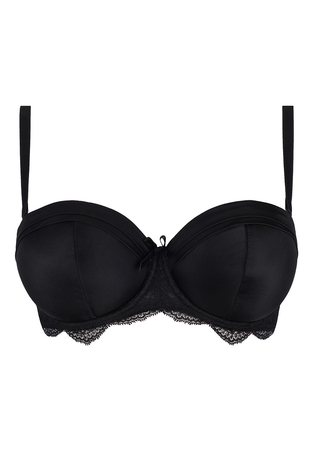 Piękny, czarny biustonosz Nadia to połączenie klasy i elegancji. Gładka faktura balkonetki push-up jest przełamana dwoma zakładkami u nasady miseczek, koronkowymi wstawkami pod biustem i kokardką pośrodku. Biustonosz urzeka prostym fasonem, miękka tkanina będzie pieszczotą dla Twojej skóry. Dodatkowym atutem biustonosza są odpinane ramiączka i wyjmowane wkładki. Model zapinany na haftki.