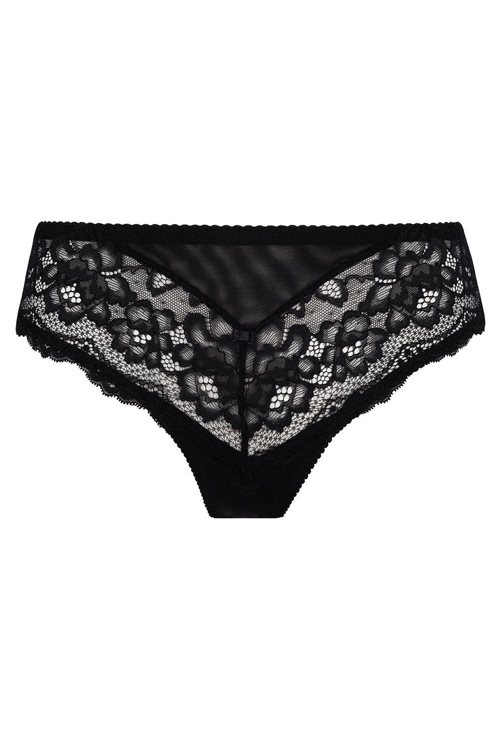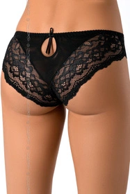 Seksowne, czarne figi Zaina. Powstały z połączenia subtelnej koronki z delikatną siateczką. Krój majtek jest bardzo zmysłowy i powabny. Idealnie podkreślają krągłość Twoich bioder. Delikatne wycięcie z tyłu z niewielką kokardą dodaje im kokieterii.