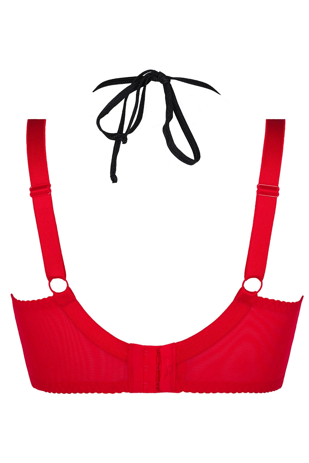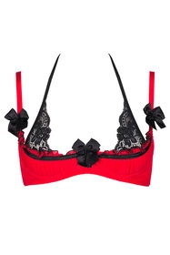 Ponętny półbiustonosz w połączeniu namiętnej czerwieni oraz głębokiej czerni.