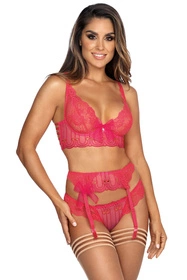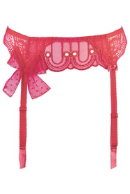 Elastyczny i delikatny pas do pończoch w kolorze nasyconej, owocowej czerwieni to zmysłowy i niezwykle kobiecy dodatek. Zapinany na haftkę, ozdobiony kokieteryjnymi kokardkami. Troczki regulowane, nieodpinane.