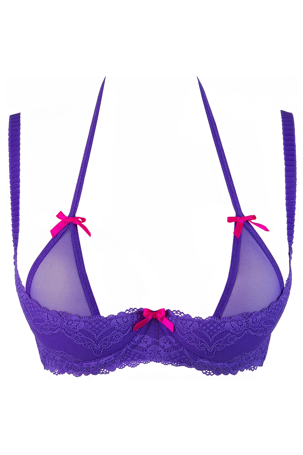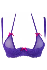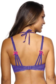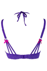 Dwu warstwowy biustonosz składający się z podstawy o stabilnej formie ozdobionej delikatną koronką oraz miękkiej miseczki wiązanej na szyi z przezroczystego tiulu o głębokiej barwie zdobionej kontrastowymi kokardkami i fantazyjnymi potrójnymi regulowanymi ramiączkami z tyłu.