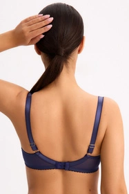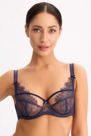 Miękki biustonosz Bella Misteria 64-146 Magiczny Szafir łączy lekką konstrukcję z pewnym podparciem dzięki fiszbinom pod miseczkami. Wieloczęściowe miseczki dopasowują się do kształtu piersi, nadając im naturalną linię bez zbędnego usztywnienia. Zapięcie z tyłu na haftki oraz regulowane ramiączka ułatwiają dopasowanie obwodu i wysokości. Stabilizujące fiszbiny pionowe po bokach dbają o utrzymanie obwodu w miejscu przez cały dzień. Koronkowe wykończenia i delikatna siateczka na górnej części miseczek dodają lekkości i subtelnych prześwitów. Metalowe haczyki przy ramiączkach zwiększają trwałość elementów narażonych na obciążenia. Gładkie wykończenia pod pachą i na mostku poprawiają komfort noszenia pod ubraniem. Materiał jest przyjemny w dotyku i pracuje z ciałem, dzięki czemu biustonosz sprawdzi się na co dzień. To propozycja dla osób ceniących wygodę, estetyczne detale i funkcjonalne podparcie bez usztywnienia.