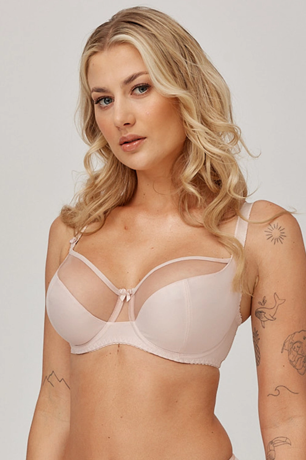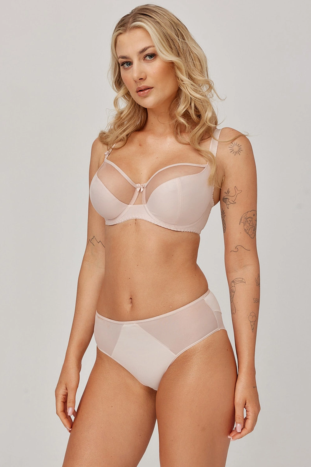Elegancki, a zarazem klasyczny miękki biustonosz w beżowym kolorze.