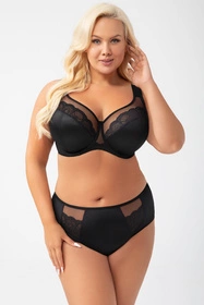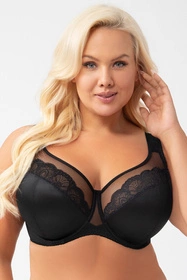 Kobiecy miękki biustonosz. Miseczki dobrze zbierają biust i utrzymują na właściwym miejscu, ładnie eksponując dekolt. Dolne części miseczek wykonane ze stabilnej, matowej dzianiny. Górna część wykonana jest z prześwitującego tiulu, na który naszyta jest piękna koronka. Mostek wykonany jest z gładniej dzianiny i tiulu. Miseczki wyprofilowane są drutem okalającym piersi. Całość sprawia, że piersi są idealnie zebrane do środka, podniesione i utrzymują piękny, zaokrąglony kształt.