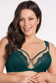Kobiecy miękki biustonosz. Miseczki dobrze zbierają biust i utrzymują na właściwym miejscu, ładnie eksponując dekolt. Dolne części miseczek wykonane ze stabilnej, matowej dzianiny. Górna część wykonana jest z prześwitującego tiulu, na który naszyta jest piękna koronka. Mostek wykonany jest z gładniej dzianiny i tiulu. Miseczki wyprofilowane są drutem okalającym piersi. Całość sprawia, że piersi są idealnie zebrane do środka, podniesione i utrzymują piękny, zaokrąglony kształt.