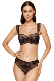 - w całości wykonany jest z beżowej siateczki pokrytej czarną koronką