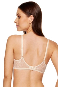 Majestatyczny biustonosz push up Gorteks Lori/B1, w odcieniu beżu, jest wyjątkowo elegancki i niepowtarzalny. Koronkowy motyw o kwiatowym wzorze, umieszczony na tylnym panelu, dodaje mu unikalnego charakteru. Niezaprzeczalne zalety tego modelu obejmują m.in. fiszbiny boczne oraz kieszonki na wkładki.