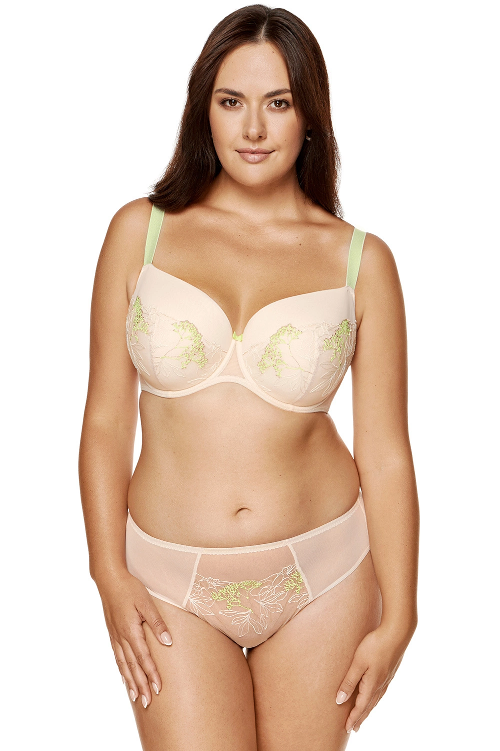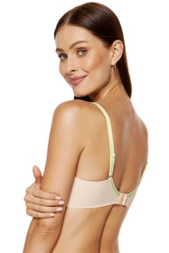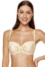 Kobiecy usztywniany biustonosz w beżowym kolorze.