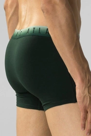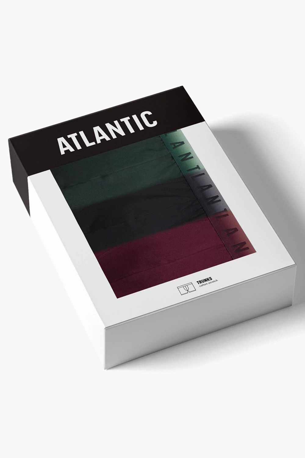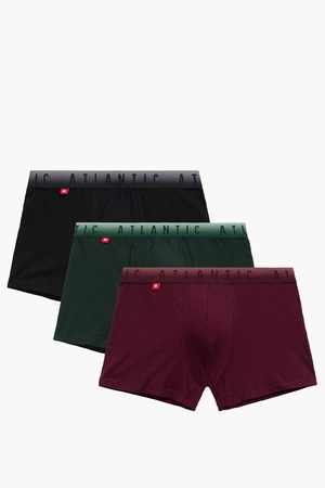 W opakowaniu znajdują się trzy sztuki bokserek męskich w różnych kolorach i wzorach.
