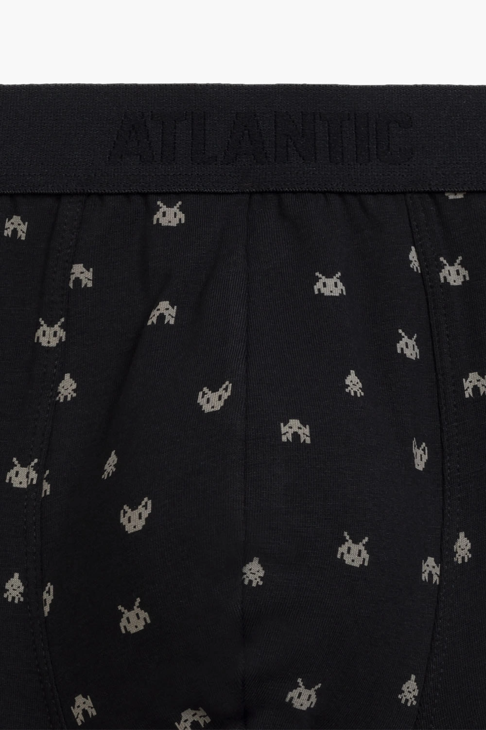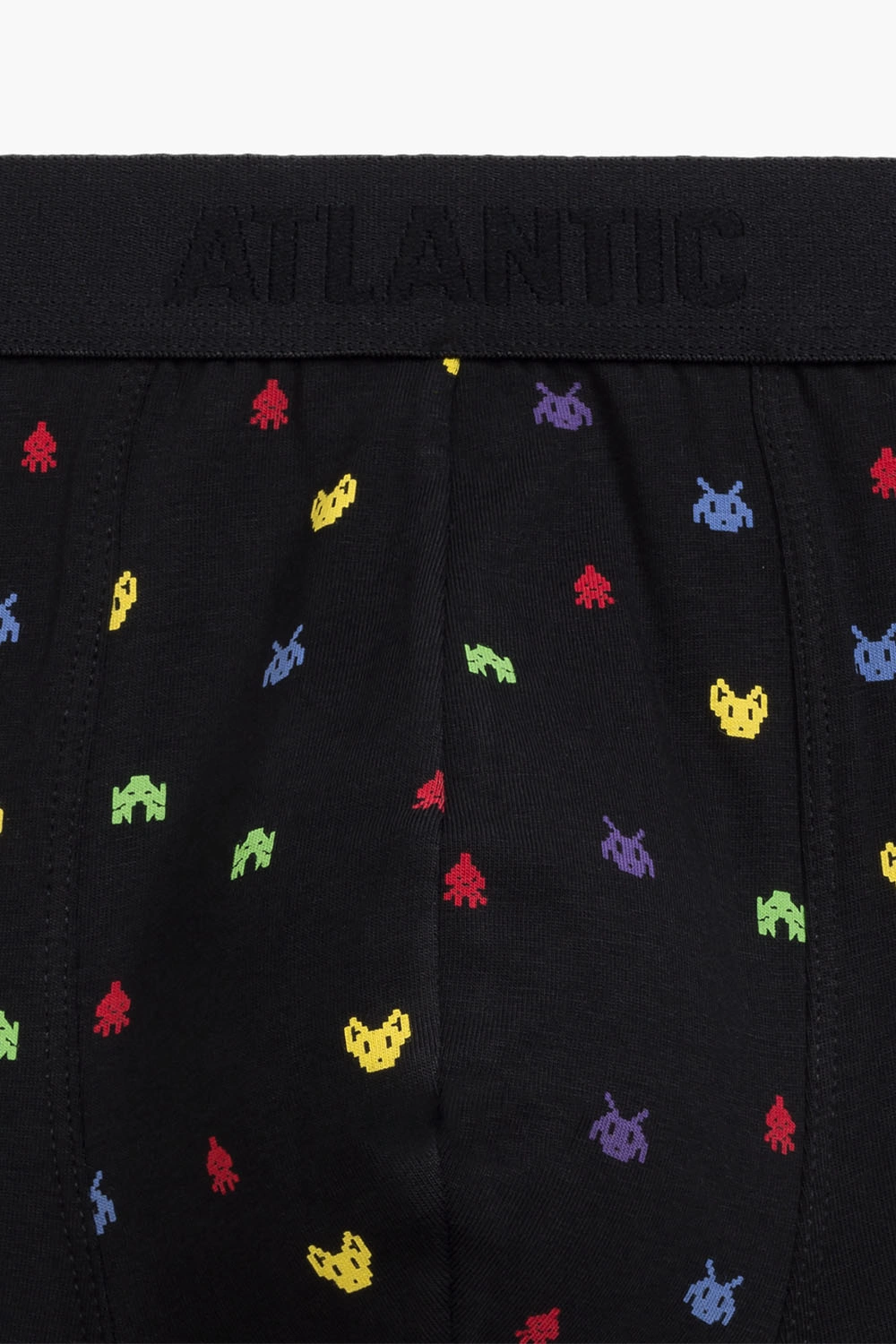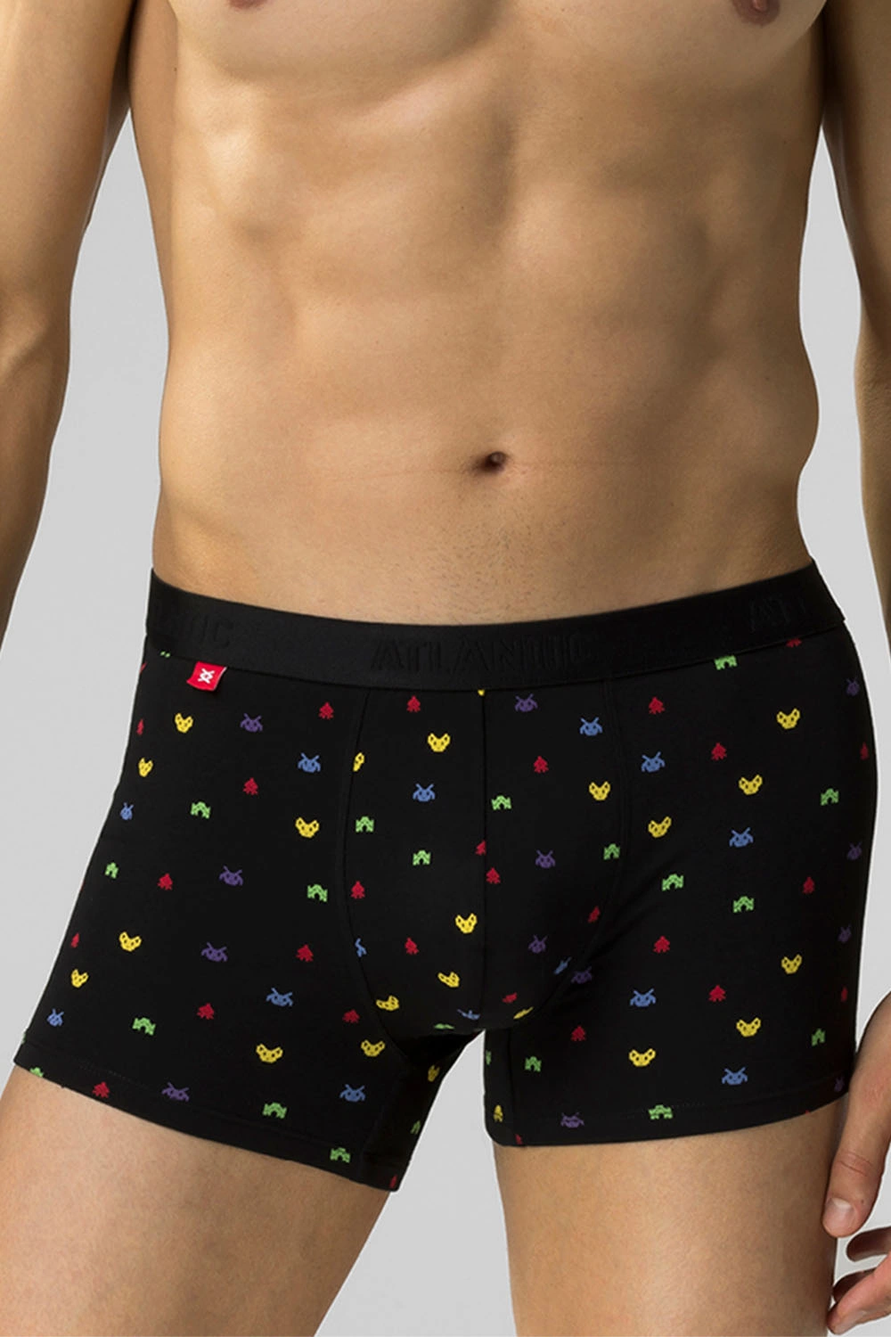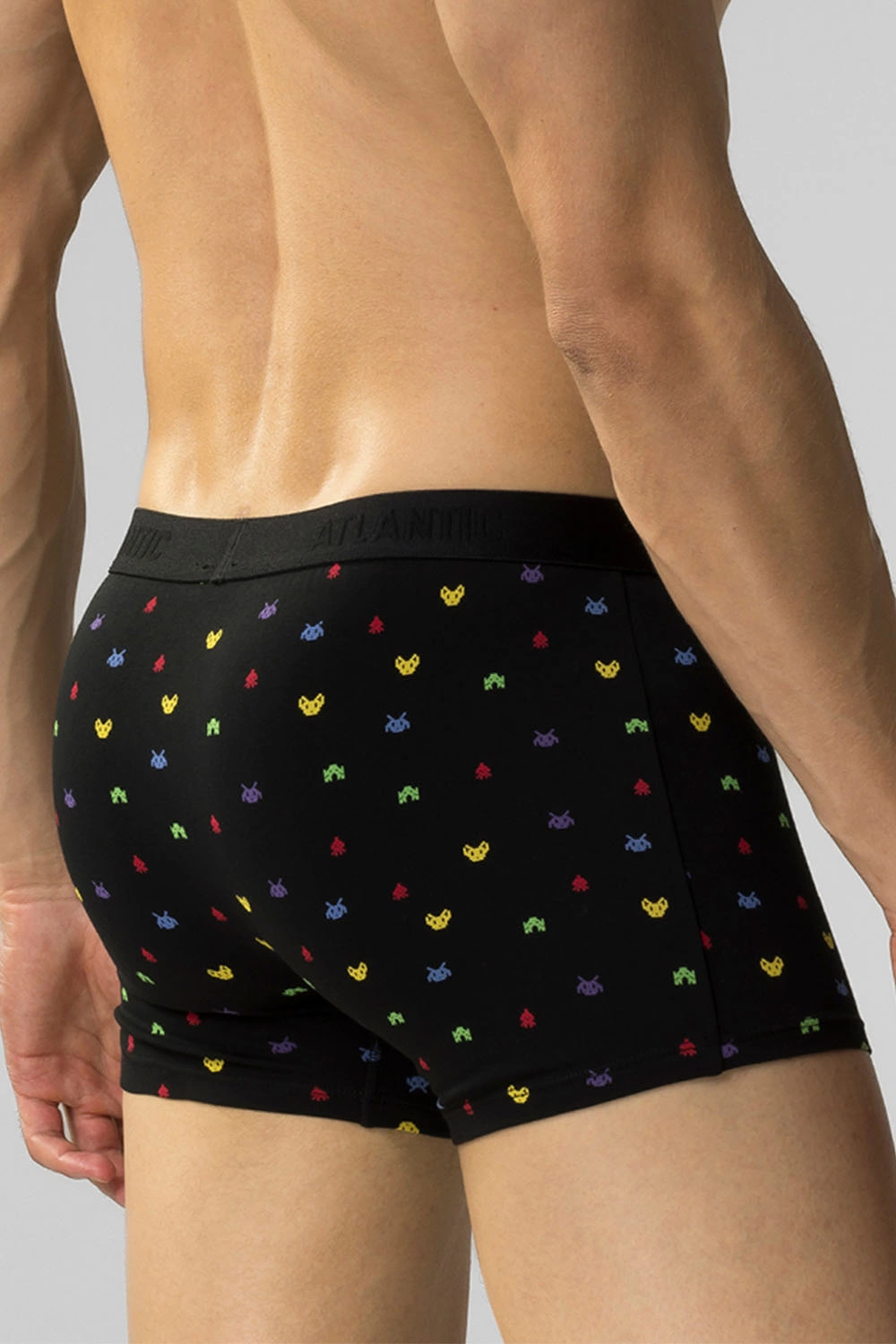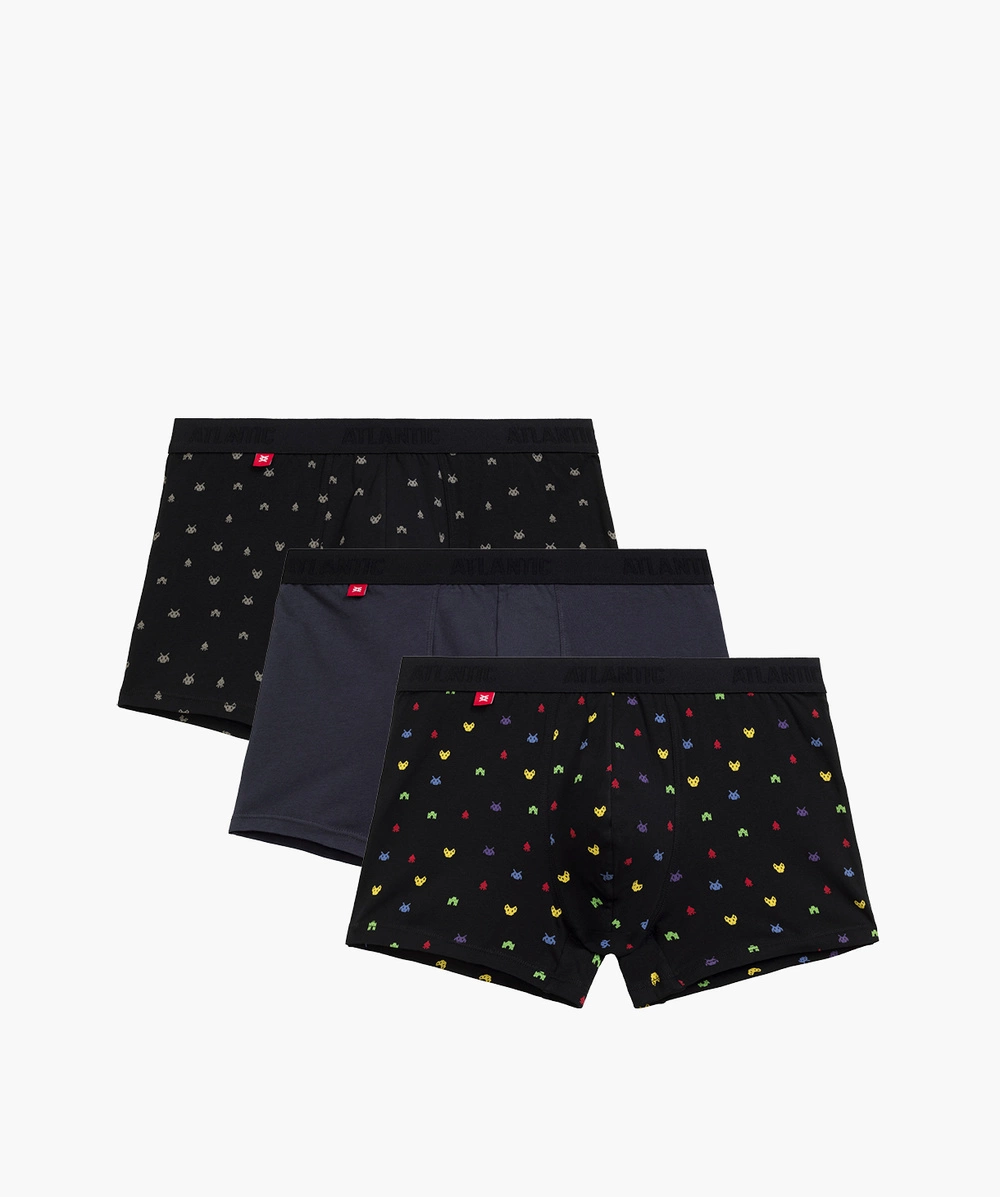 W opakowaniu znajdują się trzy sztuki bokserek męskich w różnych kolorach i wzorach.