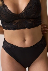 Klasyczne figi, które łączą codzienny komfort z delikatnym, kobiecym wykończeniem. Przód tworzy gładki panel, a po bokach znajdują się wstawki z miękkiej koronki o roślinnym motywie. Talia jest elastyczna i dobrze układa się na sylwetce, a krawędzie nogawek miękko przylegają do ciała. Materiał jest przyjemny w dotyku, oddychający i pracuje z ciałem, dzięki czemu sprawdza się przez cały dzień. Krój o średnim stanie zapewnia wygodne dopasowanie bez uczucia ucisku. Starannie wykończone szwy podnoszą komfort noszenia i estetykę wykonania. To model, po który sięga się intuicyjnie na co dzień, ale równie dobrze sprawdzi się pod elegancką stylizacją. Subtelna koronka dodaje lekkości, nie zaburzając funkcjonalności i gładkiej linii pod odzieżą.