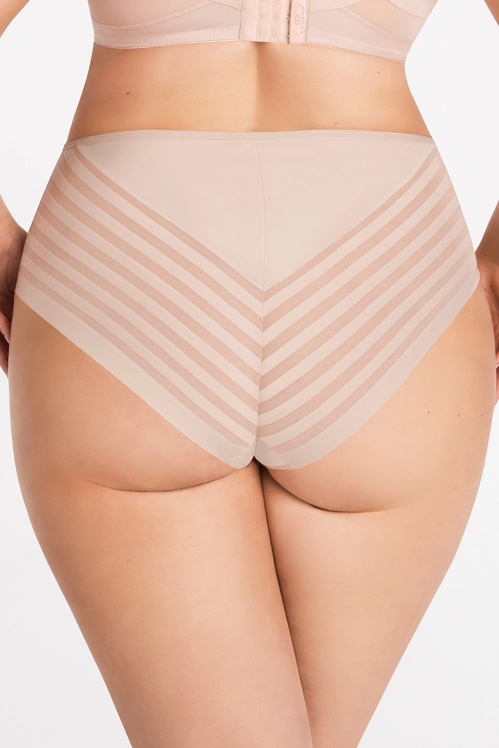 - wykonane są z gładkiej dzianiny oraz elastycznej koronki z motywem pasków