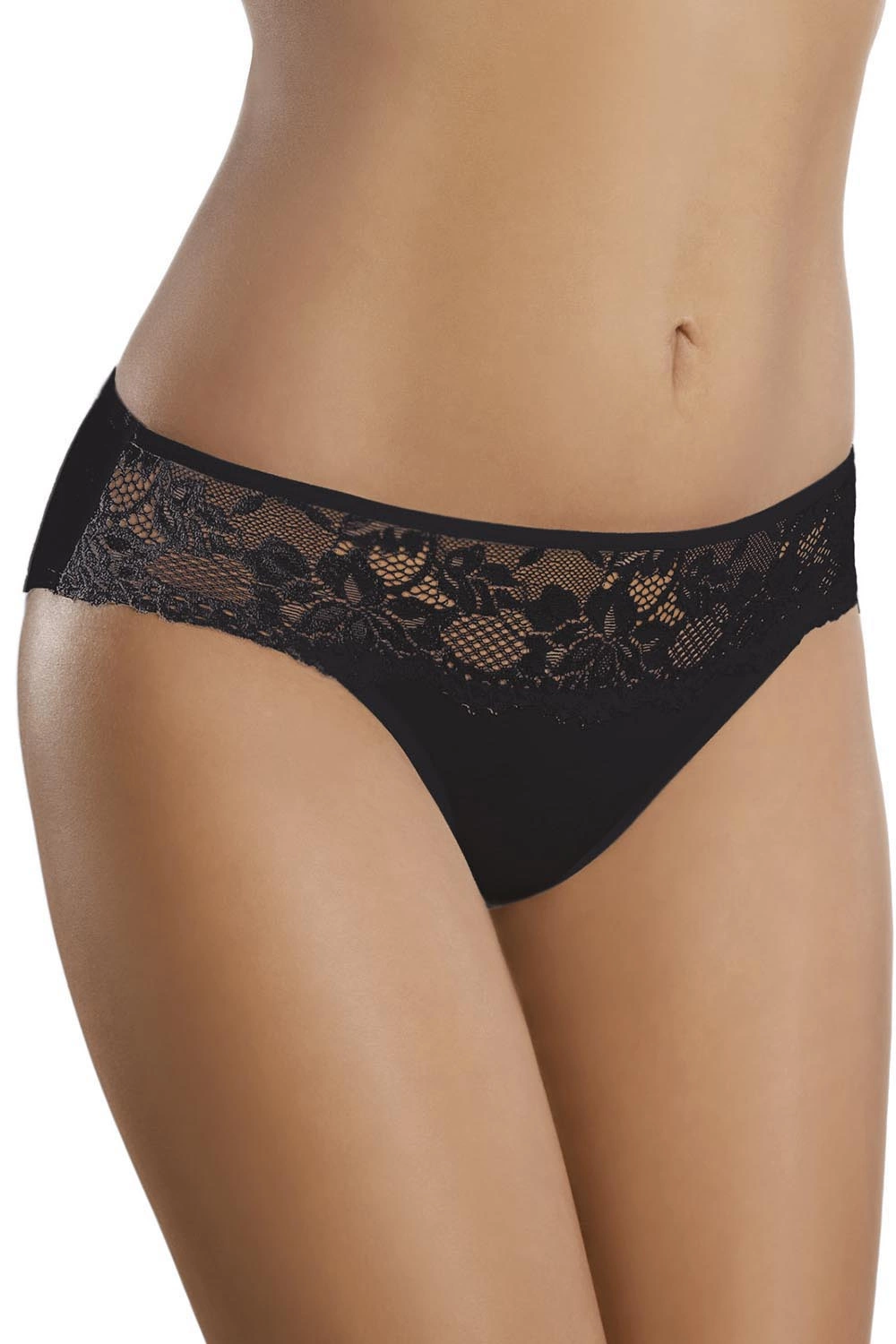 Figi damskie biodró wki, z przodu pięknie zdobione w gó rnej części imitacją koronkowego paseczka, któ ry zmysłowo podkreśla linię bioder. Doskonale przylegają do ciała, dając poczucie komfortu i wygody. Skład: 95% bawełna 5% elastan