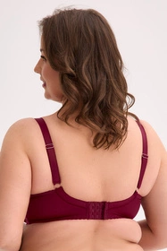 Półusztywniana konstrukcja Jovana Maxi łączy stabilne podtrzymanie z lekkim, eleganckim wykończeniem. Dolna część miseczek jest gładka i lekko usztywniona, co pomaga delikatnie modelować biust i utrzymać jego kształt w ciągu dnia. Górę tworzy półprzezroczysta siateczka z haftem o roślinnym charakterze, która dodaje lekkości i subtelnej kobiecości. Fiszbiny wspierają piersi od spodu, a solidny obwód pracuje z ciałem, nie ograniczając ruchów. Ramiączka są regulowane i wykończone metalowymi regulatorami, dzięki czemu łatwo dopasować długość do sylwetki. Zapięcie na haftki umieszczono z tyłu, co ułatwia codzienne użytkowanie. Wnętrze miseczek jest miękkie w dotyku, by zapewnić komfort nawet przy dłuższym noszeniu. Gładkie dolne panele sprawiają, że biustonosz dyskretnie układa się pod ubraniami. Subtelne detale w mostku podkreślają estetyczny charakter modelu. To propozycja na co dzień, ale także pod bardziej eleganckie stylizacje, gdy potrzebujesz pewnego wsparcia i schludnej linii biustu.