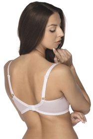 Klasyczny usztywniany biustonosz. Miseczki oraz mostek pokryte są subtelną koronką. Tył wykonany jest ze sprężystej lycry. Wewnętrzna strona podszyta jest 100% bawełną. Konstrukcja bardzo ładnie zbiera i formuje biust. Model posiada regulowane, nieodpinane ramiączka różnej szerokości w zależności od rozmiaru oraz zapięcie na haftki z tyłu. Całość uzupełniają delikatne kokardki umieszczone na styku ramiączek i misek oraz na środeczku biustonosza.
