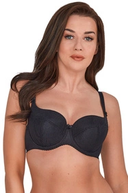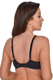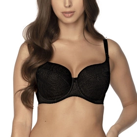 Klasyczny usztywniany biustonosz. Miseczki oraz mostek pokryte są subtelną koronką. Tył wykonany jest ze sprężystej lycry. Wewnętrzna strona podszyta jest 100% bawełną. Konstrukcja bardzo ładnie zbiera i formuje biust. Model posiada regulowane, nieodpinane ramiączka różnej szerokości w zależności od rozmiaru oraz zapięcie na haftki z tyłu. Całość uzupełniają delikatne kokardki umieszczone na styku ramiączek i misek oraz na środeczku biustonosza.
