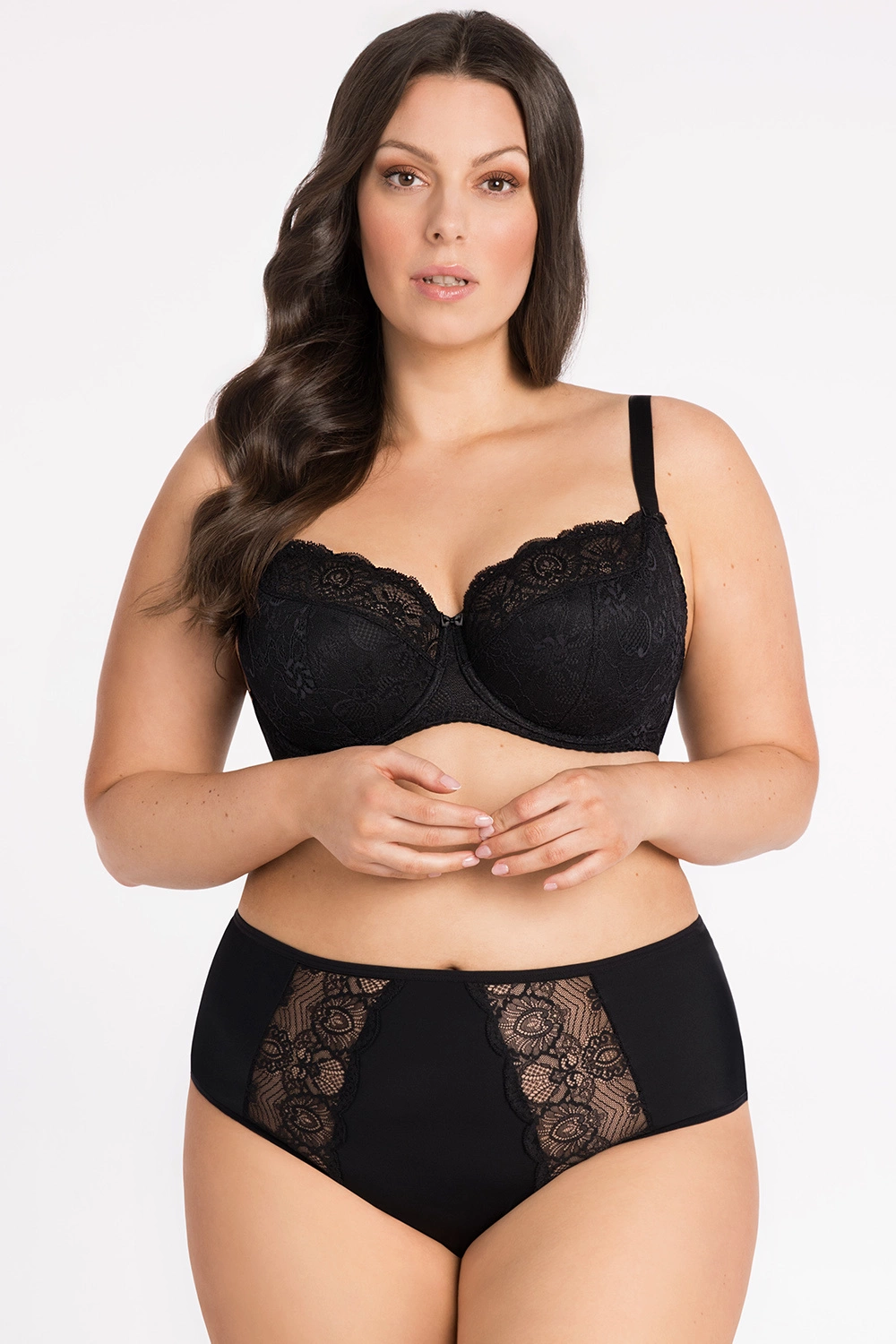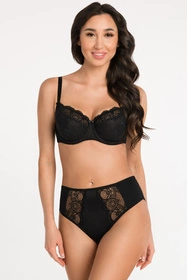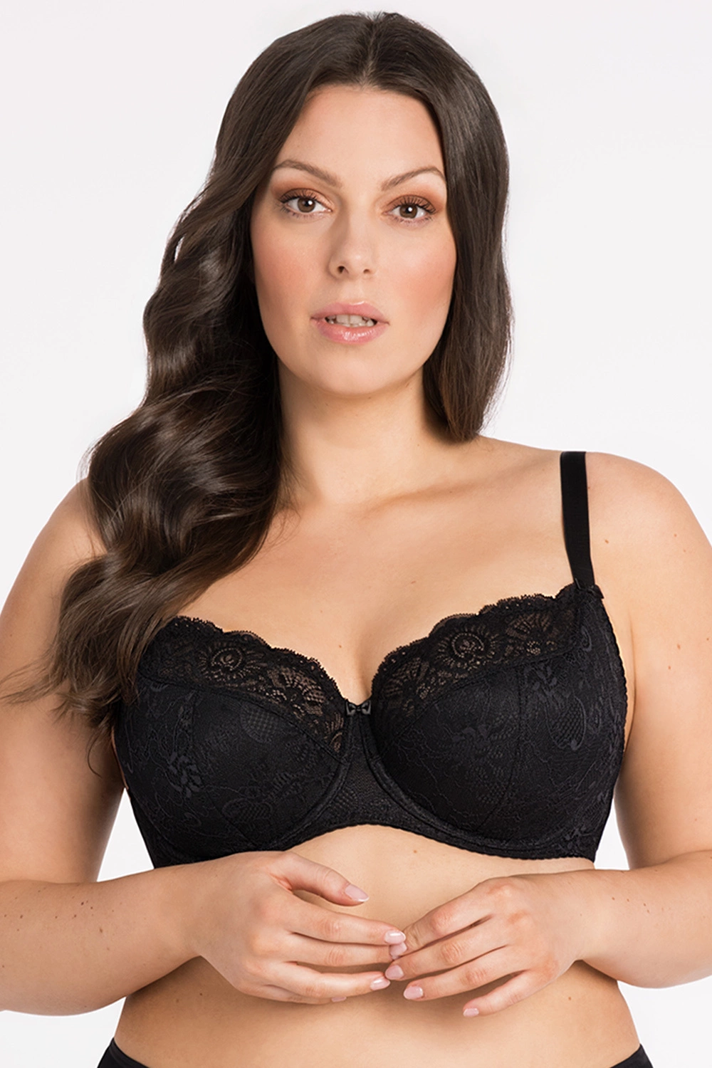 Elegancki połusztywniany biustonosz wykonany z koronki. Dolna część miseczki usztywniona jest mięciutką pianką, która dodatkowo od środka miseczki podszyta jest bawełną, co znacznie poprawia komfort użytkowania. Górna część miseczki wykonana jest z koronki podszytej delikatną, nie ciągnącą się siateczką co sprawia, że biustonosz ładnie przylega do biustu. Całość sprawia, że piersi są idealnie zebrane do środka, podniesione i utrzymują piękny, zaokrąglony kształt.