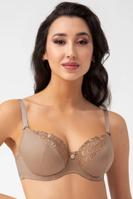 Klasyczny miękki biustonosz. Wykonany z gładkich surowców połączonych eleganckim haftem. Miseczki dobrze zbierają biust i utrzymują na właściwym miejscu, ładnie eksponując dekolt. Dolna część miseczek wykonana ze stabilnej, gładkiej, matowej dzianiny. Górna część wykonana jest z haftu dla wzmocnienia podszytego delikatną siateczką. Na środku, pomiędzy miseczkami kokardka ozdobiona malutką biżuterią.