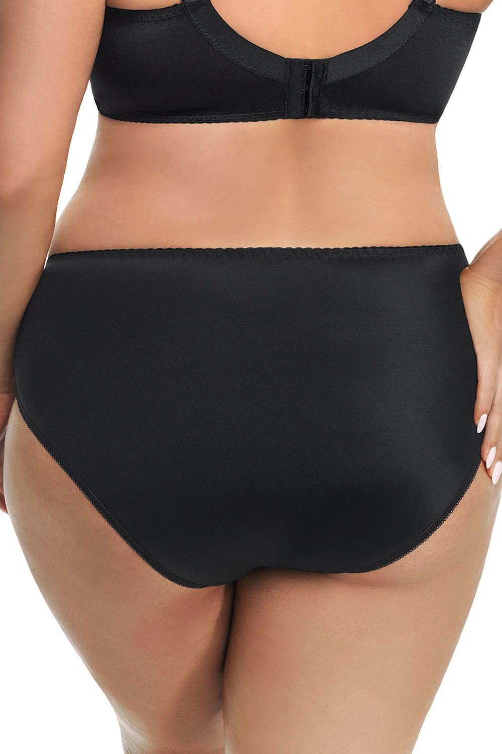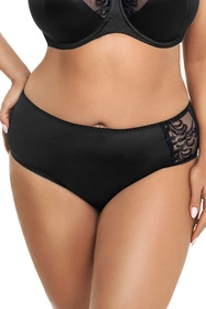 Klasyczne, pełne figi wykonane z gładkiej mikrofibry. Z boku wstawka z pięknego haftu na siateczce. Nogawki oraz tył wykończone są delikatną gumokoronką.