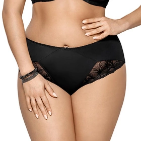 Eleganckie, bardzo wygodne, klasyczne figi. Wykonane z miękkiej microfibry. Z przodu ozdobione dwoma wstawkami z koronki oraz małą kokardką pośrodku. Tył gładki, nogawki wykończone delikatną koronką.