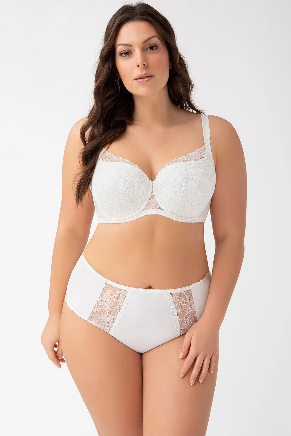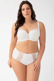 Pełne figi damskie. Wykonane są z gładkiej dzianiny. Przód i tył zdobią wstawki z kwiecistej koronki.