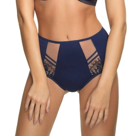 Wysokie figi typu brazylian wykonane z miękkiej mikrofibry ozdobionej z przodu wstawkami z tiulu i delikatnej koronki. Tył gładki. Nogawki z przodu wykończone gładką taśmą elastyczną. Z tyłu nogawki wykończone gładko podwójnie złożonym tiulem elastycznym.