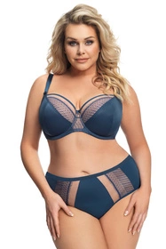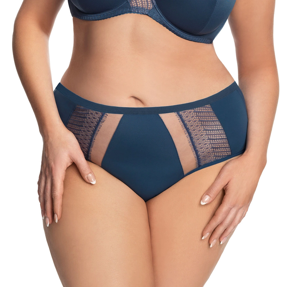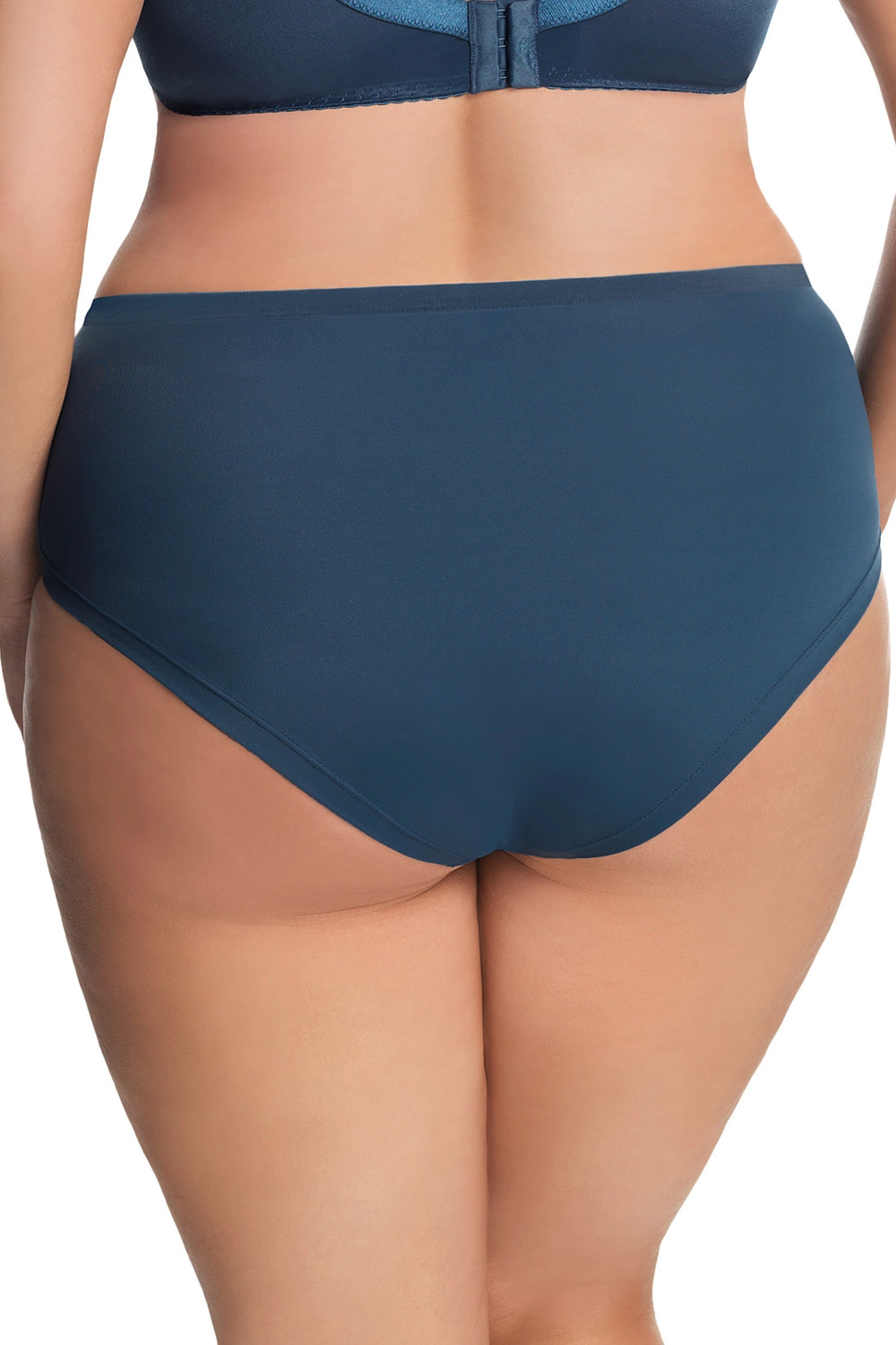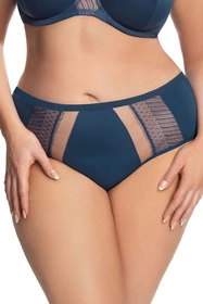 Klasyczne pełne figi wykonane z mikrofibry. Przód ozdobiony dwoma wstawkami z tiulu i delikatnej koronki, dół obszyty gładką, delikatną taśmą elastyczną. Tył gładki, wykończony na płasko przez podwinięcie dzianiny.