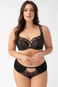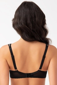 Miękka pianka usztywniająca w dolnych częściach miseczek. Górne części misek biustonosza dla wzmocnienia podszyte są tiulem. Środek biustonosza idealnie przylega do mostka. Boczki wykonane są z lycry o wysokiej gramaturze, odpornej na rozciąganie. Miseczki wyprofilowane są drutem okalającym piersi. Całość sprawia, że piersi są idealnie zebrane do środka, podniesione i utrzymują piękny, zaokrąglony kształt.