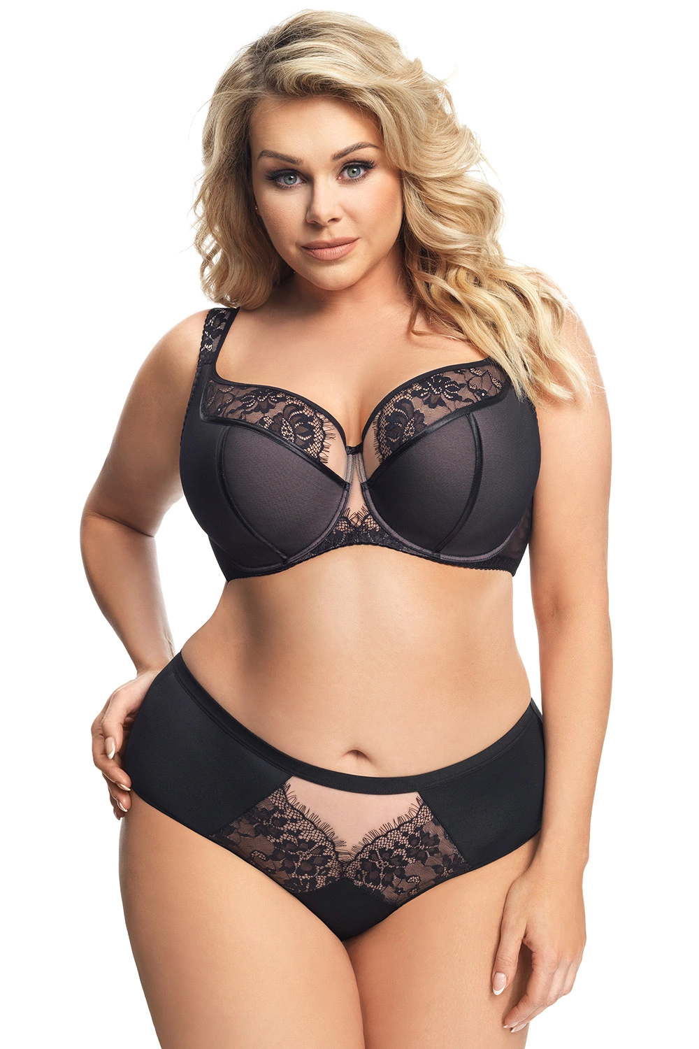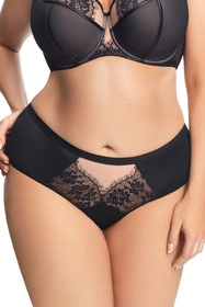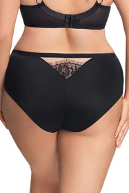Eleganckie figi z wysokim stanem. Wykonane z miękkiej mikrofibry ozdobionej z przodu i z tyłu wstawkami z tiulu i delikatnej koronki. Tył gładki. Nogawki z przodu wykończone gładką taśmą elastyczną. Z tyłu nogawki wykończone gładko podwójnie złożonym tiulem elastycznym.