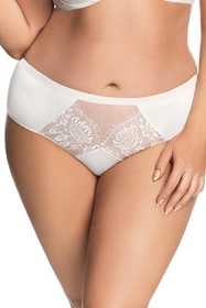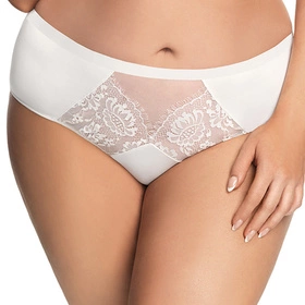 Eleganckie figi z wysokim stanem. Wykonane z miękkiej mikrofibry ozdobionej z przodu i z tyłu wstawkami z tiulu i delikatnej koronki. Tył gładki. Nogawki z przodu wykończone gładką taśmą elastyczną. Z tyłu nogawki wykończone gładko podwójnie złożonym tiulem elastycznym.