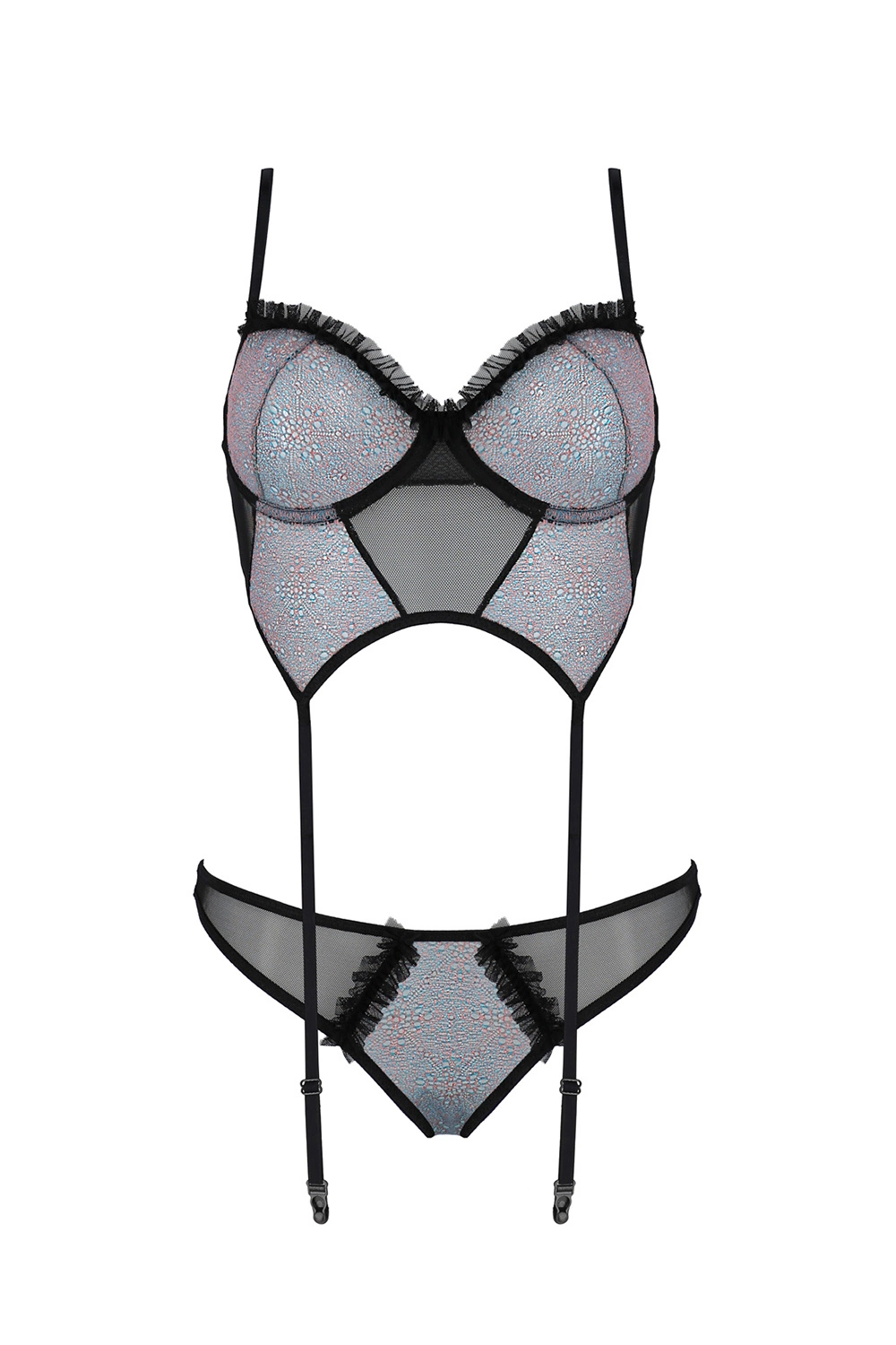 - wykonany z czarnej siateczki oraz niebieskiej koronki