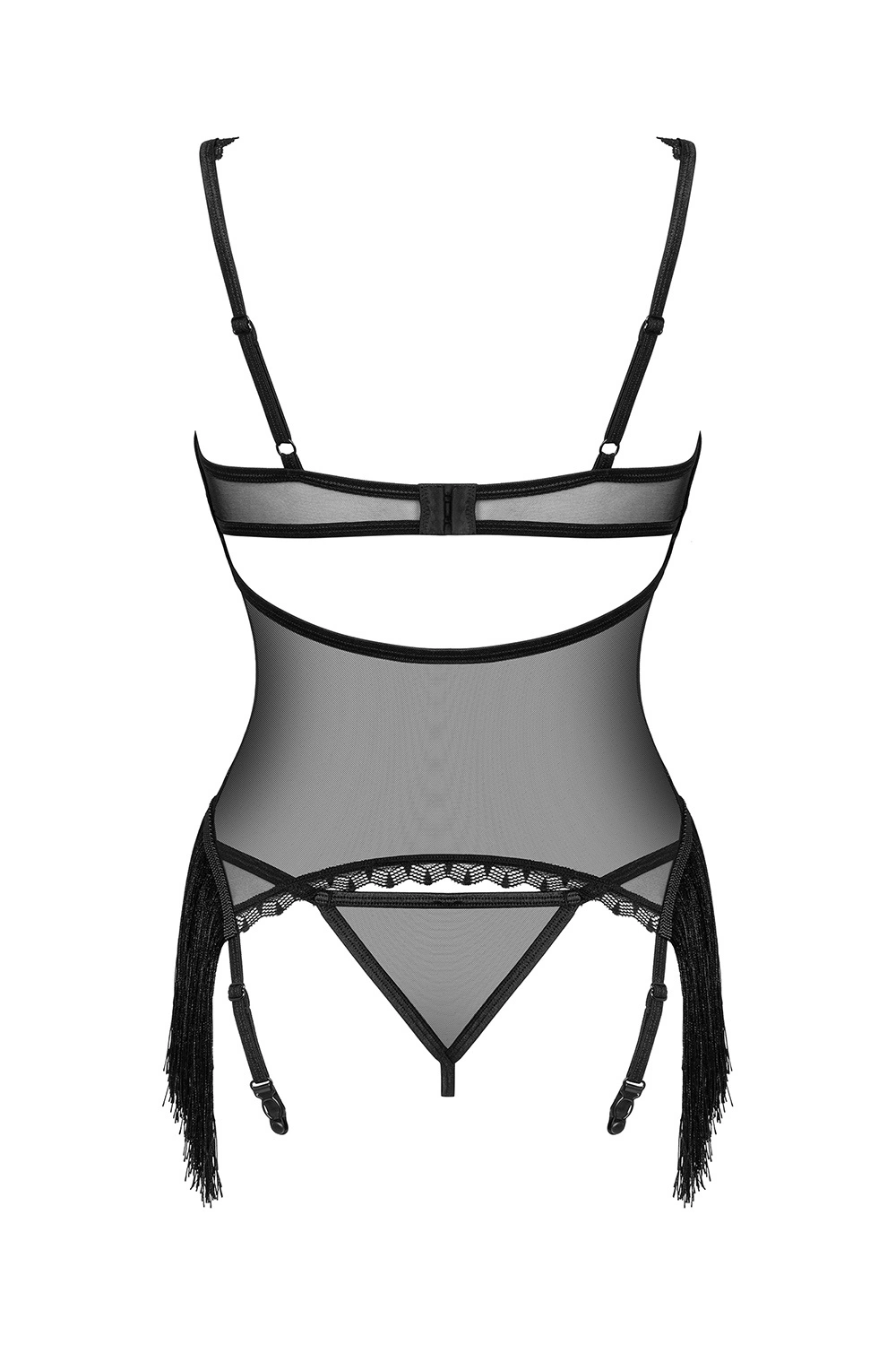 Wyglądaj zniewalająco, odkryj nieziemską pewność siebie i kuś razem z uwodzicielskim gorsetem Sherila. Szczególnej pikanterii dodają pobudzające fantazję detale – seksowne paski do pończoch, cienkie frędzelki przysłaniające piersi oraz minimalistyczne, koronkowe wykończenia. Przyjemnie prześwitujący materiał przylega do ciała z prawdziwą lekkością, dzięki czemu poczujesz się całkiem naturalnie i będziesz mogła oddać się niezapomnianym chwilom.