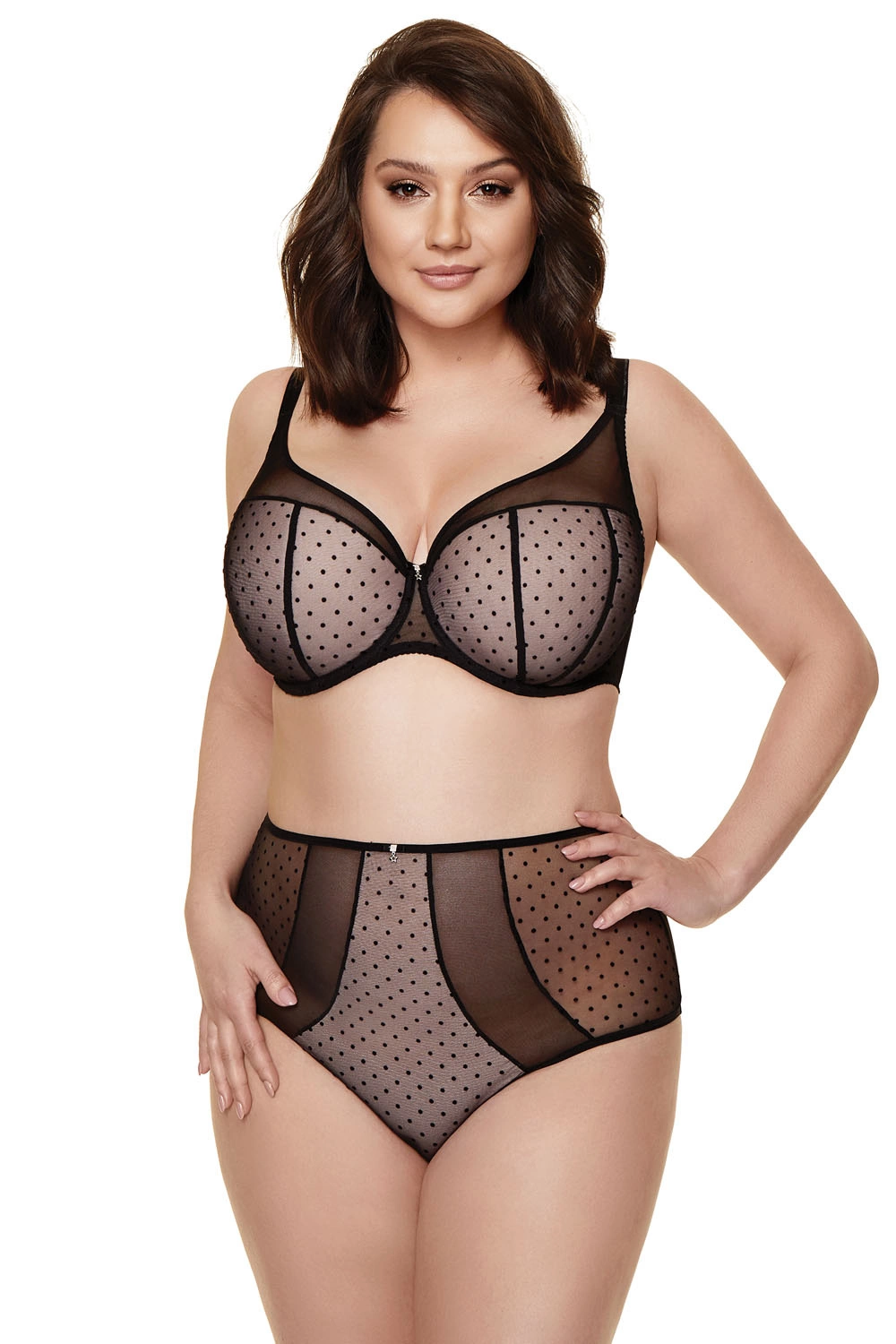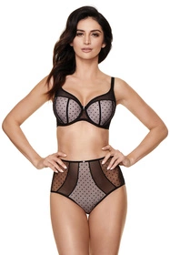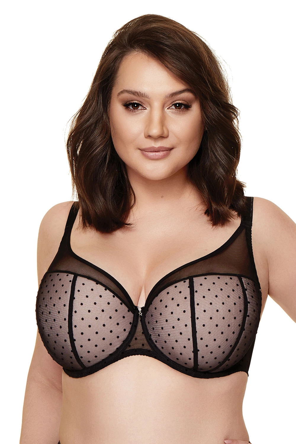 Uroczy biustonosz usztywniany doskonale modeluje piersi. Miseczki obszyte tiulem w zalotne kropki. Ozdoba w kształcie gwiazdki umieszczona pomiędzy miseczkami dodaje biustonoszowi uroku.