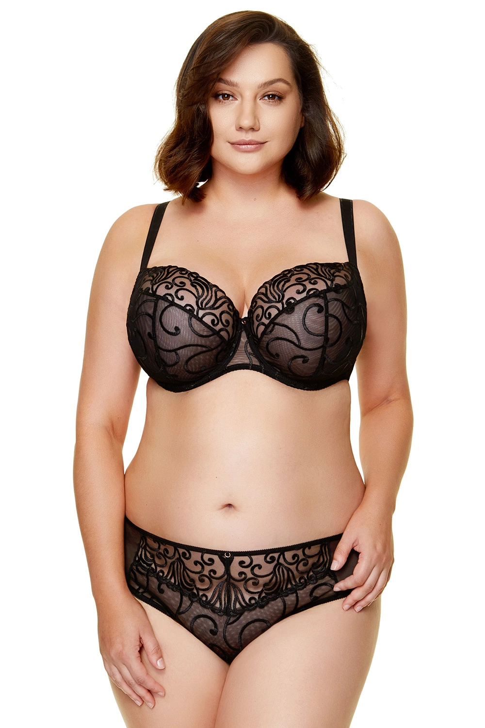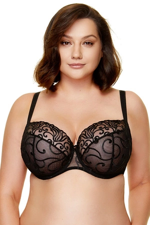 Kuszący biustonosz z miękkimi miseczkami zapewnia atrakcyjnie wyglądający dekolt. Miseczki wykonano z tiulu elastycznego, obszytego ozdobnym haftem w kolorze białym.
