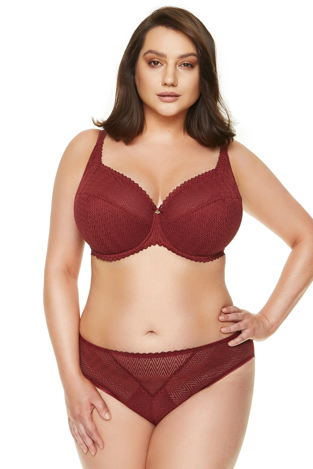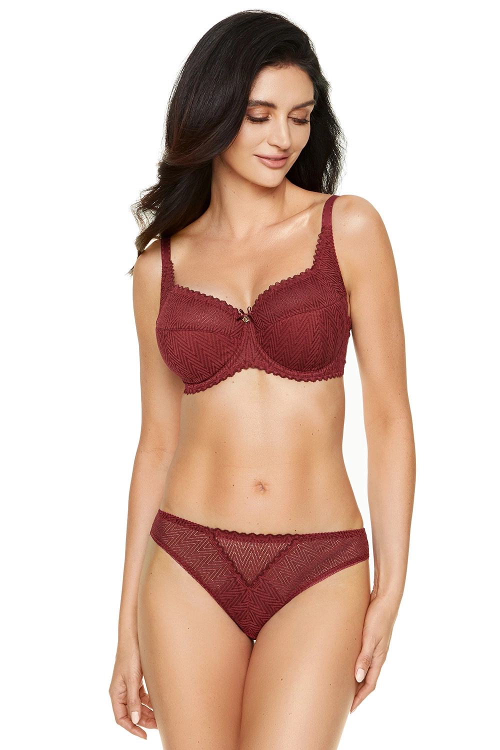 Delikatny biustonosz półusztywniany doskonale podtrzymuje piersi. Miseczki obszyto nietuzinkową koronką o geometrycznym wzorze.