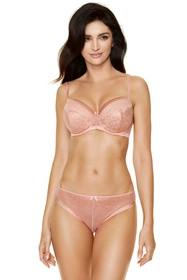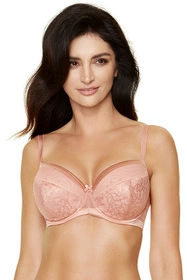 Uwodzicielski biustonosz usztywniany doskonale podkreśla kobiece kształty. Miseczki zostały pokryte koronką z motywem kwiatowym i satynowym wykończeniem.