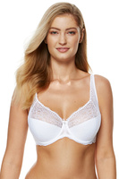 Zmysłowy i uwodzicielski biustonosz półusztywniany doskonale podkreślający i podtrzymujący biust. Wykonany w całości z wyrafinowanej koronki ozdobionej delikatnym kwiatowym motywem. Dolna część miseczek usztywniona gąbką gorseciarską, od wewnątrz pokrytą bawełną. Malutka kokardka i połyskujące zdobienie umieszczone między miseczkami dodają biustonoszowi wyjątkowego uroku. Boczki dodatkowo wzmocnione delikatną siateczką i fiszbinami pionowymi. Model posiada ozdobne, nieodpinane, regulowane ramiączka. Z tyłu trzystopniowe zapięcie na dwie haftki.