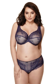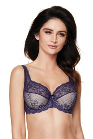 Zmysłowy i uwodzicielski biustonosz półusztywniany doskonale podkreślający i podtrzymujący biust. Wykonany w całości z wyrafinowanej koronki ozdobionej delikatnym kwiatowym motywem. Dolna część miseczek usztywniona gąbką gorseciarską, od wewnątrz pokrytą bawełną. Malutka kokardka i połyskujące zdobienie umieszczone między miseczkami dodają biustonoszowi wyjątkowego uroku. Boczki dodatkowo wzmocnione delikatną siateczką i fiszbinami pionowymi. Model posiada ozdobne, nieodpinane, regulowane ramiączka. Z tyłu trzystopniowe zapięcie na dwie haftki.