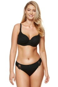 Elegancki i klasyczny biustonosz usztywniany doskonale podtrzymujący biust. Miseczki wykonane z dzianiny gładkiej, otulone pięknym haftem. Tył biustonosza wykonany z dzianiny gładkiej. Między miseczkami delikatna kokardka. Model posiada pionowe fiszbiny boczne, regulowane, odpinane ramiączka różnej szerokości w zależności od rozmiaru oraz zapięcie na haftki.