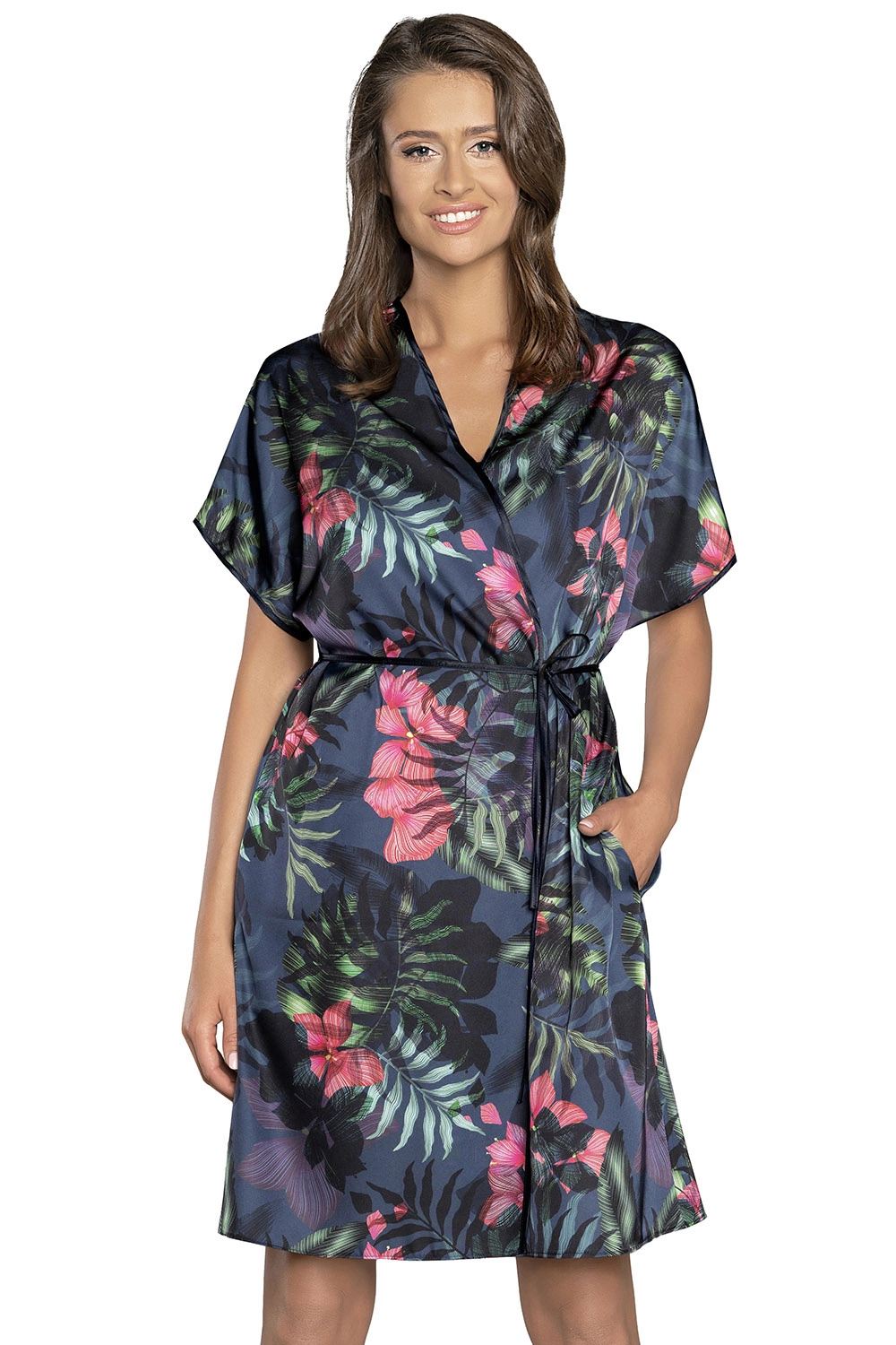Szlafrok Amazonia stworzony jest z najwyższej, jakości satyny w fantazyjnych i uwodzicielskich kolorach granatu, zieleni, różu i fioletu. Połączenie to oddaje jego kokieterię i zmysłowość. Piękna dzianina w kwiatowy nadruk fantastycznie otula sylwetkę.Szlafrok o luźnej linii z kieszeniami. W talii wiązany paskiem.