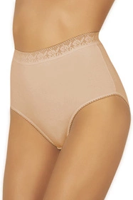 Pełne figi, wykonane z komfortowej dzianiny. Wykończone ozdobną gumokoronką z kwiatowym motywem. Spodobają się każdej Pani, dla której podstawą jest wygoda i prostota. Niewątpliwą zaletą jest też dostępność tego modelu w do rozmiaru XXL. Skład: 90% bawełna, 10% elastan.