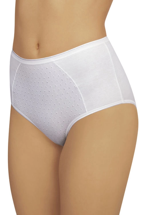 Figi wykonane z dzianiny elastycznej z ozdobną wstawką z przodu. Klasyczny fason w połączeniu z dużym dodatkiem elastanu koryguje zbyt krągłe biodra i wyszczupla brzuch. Klasyczne, wygodne, a zarazem eleganckie. Skład: 90% bawełna,10% elastan.